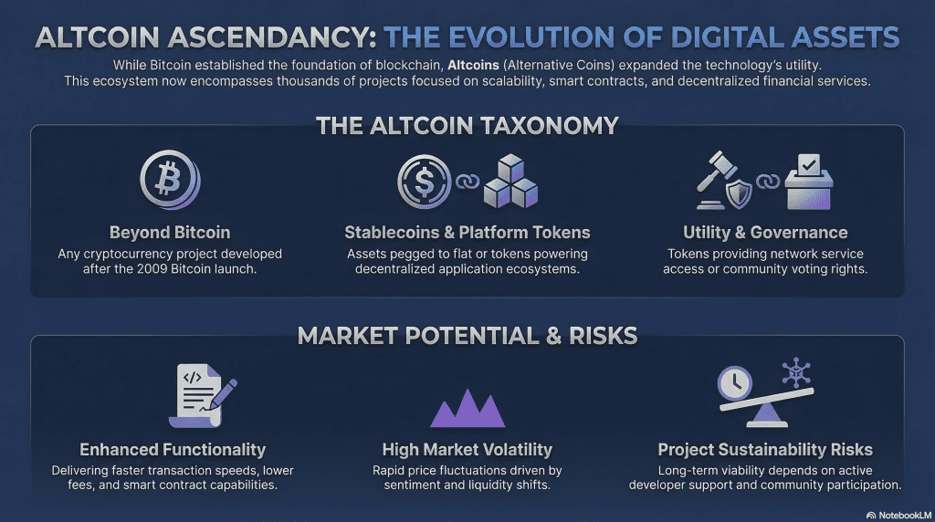 These alternative cryptocurrencies became known as altcoins, a term derived from “alternative coins.” Altcoins now represent a large portion of the cryptocurrency ecosystem, with thousands of projects developed for different purposes.
